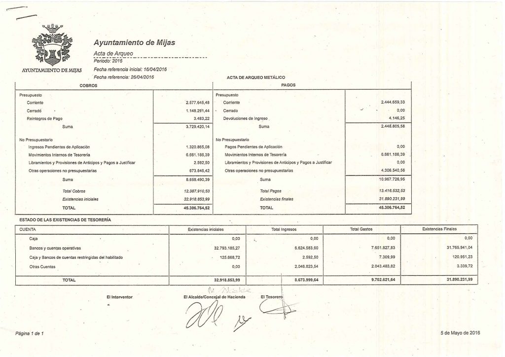 Se trata no sólo del pago anticipado del préstamos a proveedores, sino también de otros créditos antiguos y deudas por expropiaciones El acta de arqueo del 25 de abril de 2016 –cuando Maldonado expulsó al PP del gobierno municipal- confirma que el Ayuntamiento tiene 31,9 millones de euros en el banco