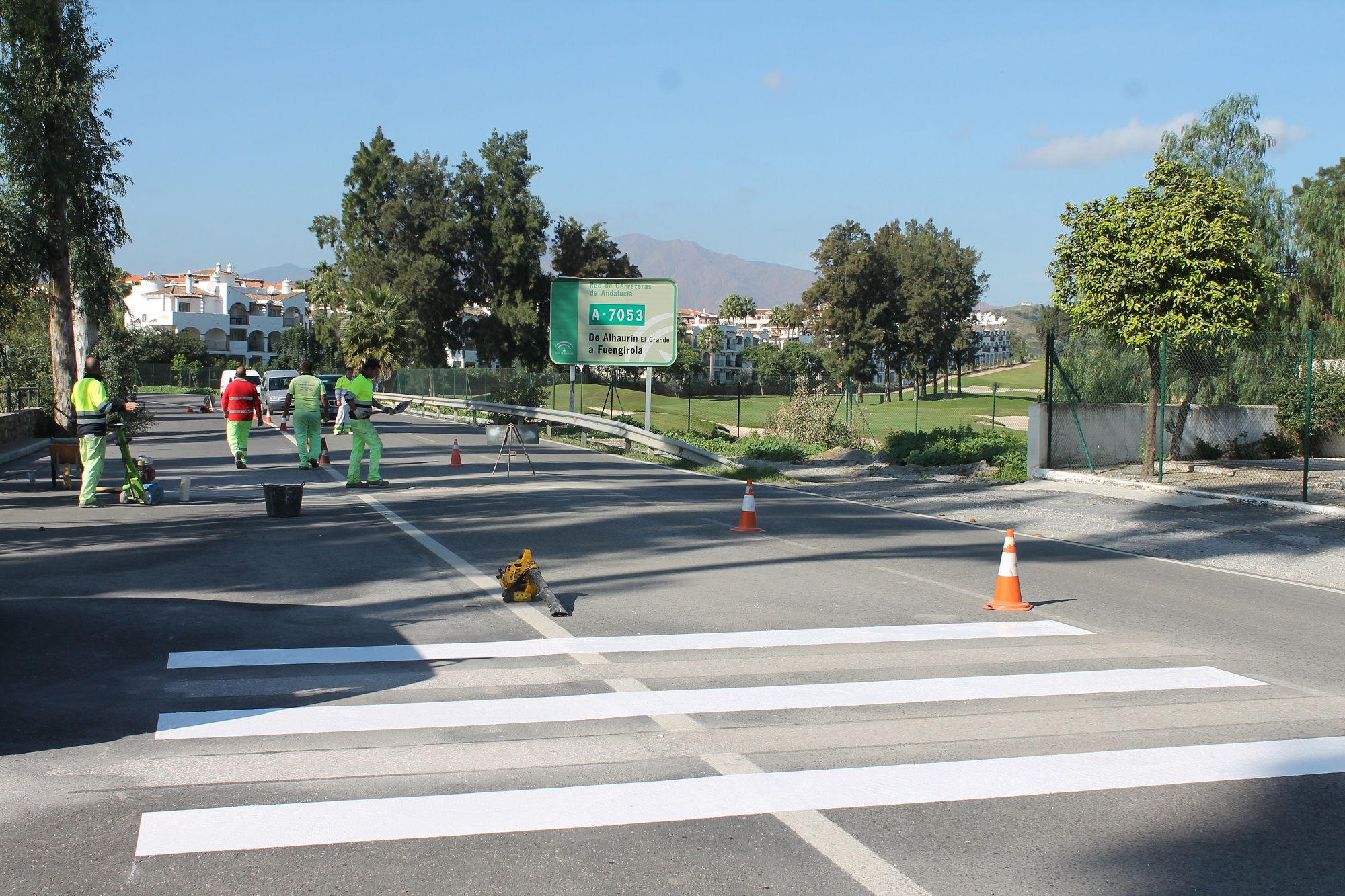 Se trata de una nueva medida del equipo de gobierno destinada a mejorar la seguridad vial en este tramo del camino de Coín. Apenas un kilómetro antes -en sentido Coín- el Consistorio ha culminado la ejecución de la rotonda que da acceso a la urbanización Mijas Golf, y en el mismo tramo donde se ubica el nuevo paso de cebra, el Ayuntamiento ha instalado varias farolas para alumbrar el vial y mejorar la visibilidad de los peatones que puedan estar circulando por el arcén o las aceras de los residenciales cercanos.