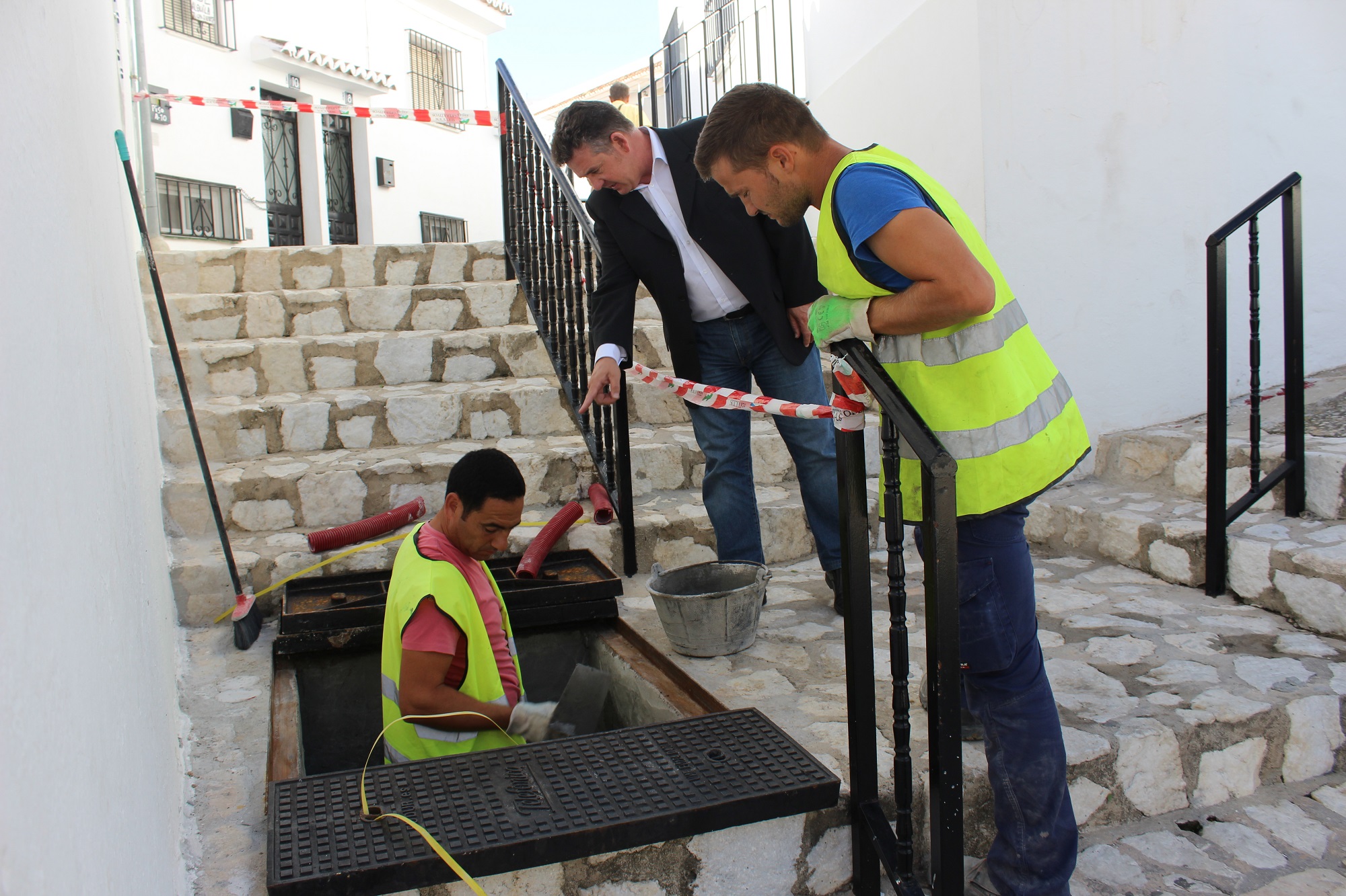 Mijas, 22 de agosto de 2014.- El concejal de Energía y Eficiencia en el Ayuntamiento de Mijas, José Francisco Ruiz Fontalba, ha estado hoy en el centro de Mijas Pueblo para comprobar el desarrollo de los trabajos de creación de las canalizaciones para soterrar los numerosos cables que cuelgan de las fachadas de algunas de sus vías, como la calle Francisco Corro, en la que actualmente se centran estas labores.