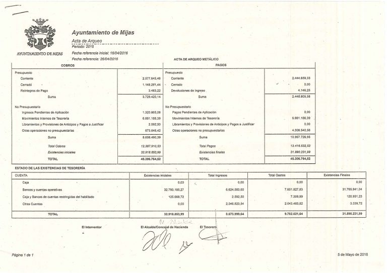 El acta de arqueo del 25 de abril de 2016 –cuando Maldonado expulsó al PP del gobierno municipal- confirma que el Ayuntamiento tiene 31,9 millones de euros en el banco