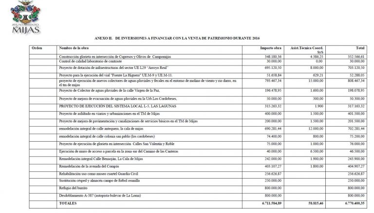 “La lista de inversiones que pensábamos ejecutar con ese dinero se incluyó en el presupuesto, para ser financiada con la venta de suelo no necesario para los fines municipales. Ante la inactividad del concejal de Patrimonio, Andrés Ruiz (C’s), ya solicité oficialmente al interventor, en marzo de 2016, que autorizara el pliego de condiciones para la venta de una parcela que el Ayuntamiento tiene en el sector C-23 (cerca del polideportivo de La Cala), que en su momento los técnicos municipales valoraron en cuatro millones, pero que hoy podría valer incluso siete, que es más o menos el total de las inversiones”, explicó el edil.