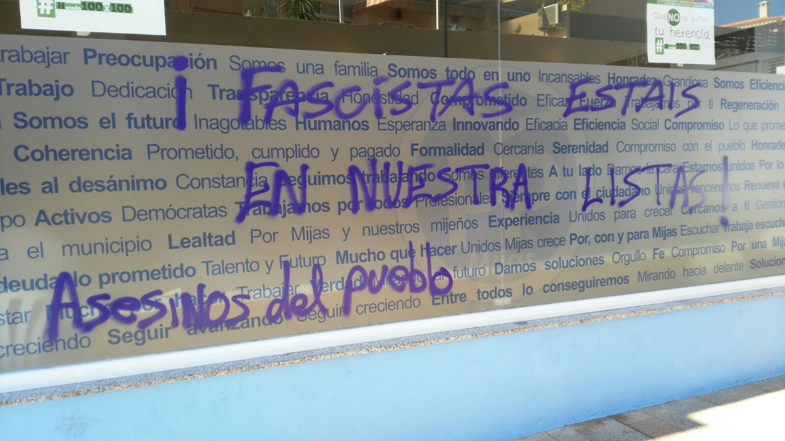 Mijas, 29 de febrero de 2016. La fachada sede del Partido Popular de Mijas ha aparecido hoy con una serie de pintadas amenazantes y antidemocráticas muy graves. Este ataque ha sido puesto ya en conocimiento de la Guardia Civil a fin de que la Benemérita pueda iniciar una investigación, dar con los autores de este inexplicable acto vandálico y puedan ser así puestos a disposición de la Justicia tarde o temprano.