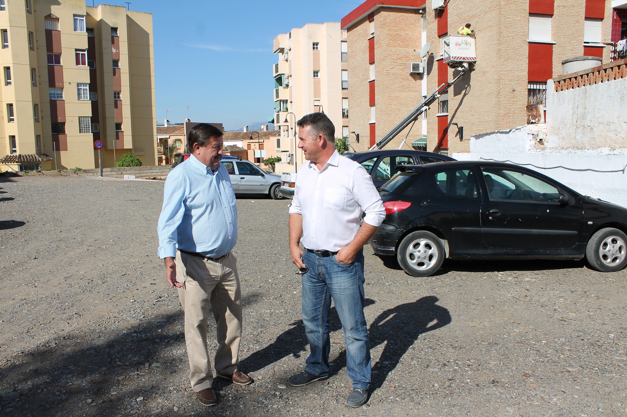 Mijas, 2 de octubre de 2015.- El concejal de Energía y Eficiencia, José Manuel Muñoz, y el coordinador del ramo, José Francisco Ruiz Fontalba, ha estado hoy en El Juncal, donde han informado de los trabajos de instalación de dispositivos de iluminación, que reforzarán la sensación de seguridad en este solar, donde pueden estacionar cerca de un centenar de vehículos.