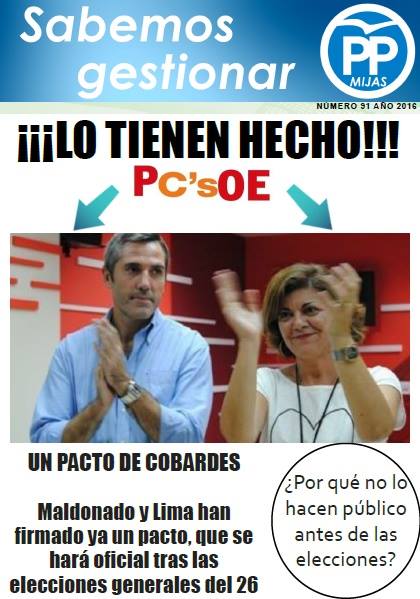 Desde que Maldonado decidió expulsar a los once concejales del PP del gobierno de Mijas y robar sus votos para ocupar ilícitamente el sillón de la Alcaldía, el PP ha preguntando en más de cinco ocasiones a Fuensanta Lima si va a pactar con su excompañero de partido y formar gobierno con él. En ninguna de las ocasiones ha respondido, ni tan siquiera cuando se le ha preguntado en público en una sesión plenaria.