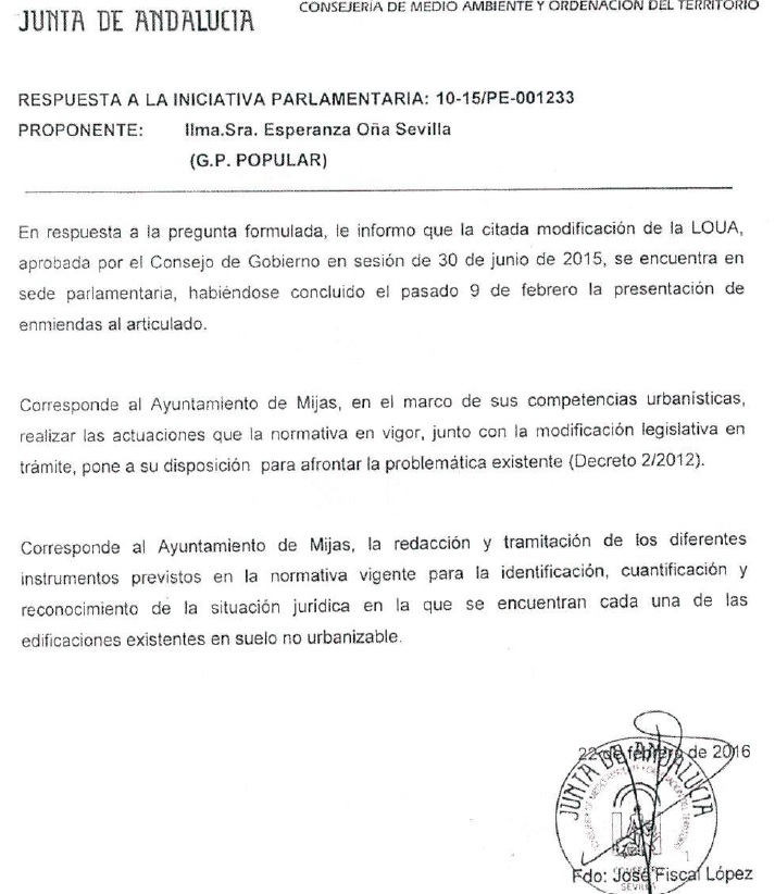 De hecho, tan sólo dice que el 9 de febrero finalizó el periodo de enmiendas al articulado y que el documento está “en sede parlamentaria” y que corresponde al Ayuntamiento de Mijas “realizar las actuaciones que la normativa en vigor, junto con la modificación legislativa en trámite” establecen y, por otro lado, que también es responsabilidad del Consistorio la “identificación, cuantificación y reconocimiento de la situación jurídica” de cada una de las edificaciones erigidas en suelo no urbanizable.