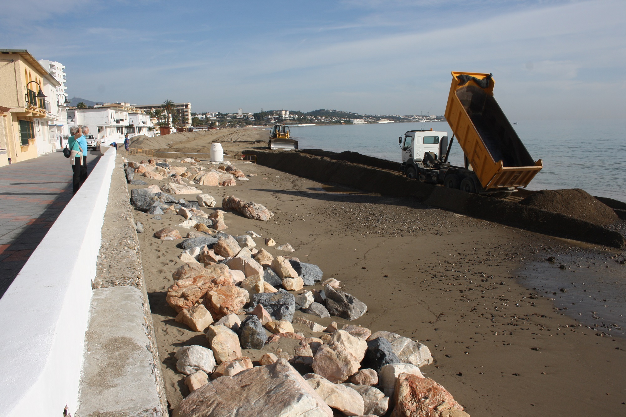 Mijas, 18 de diciembre de 2015.- La playa de Los Cordobeses está recibiendo estos días un aporte de 20.000 metros cúbicos de arena para regenerar su maltrecha línea litoral, que durante el último año ha sufrido numerosos temporales que se han llevado una cantidad importante de su arenal.