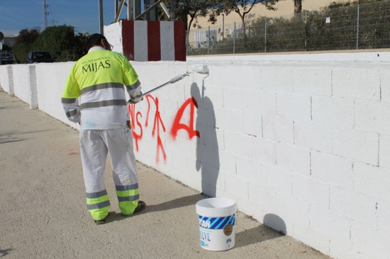 ff8b7d6b1714eed4d58a8c0a3fb069e4_LEl equipo de gobierno del Ayuntamiento de Mijas ha anunciado “la máxima dureza y la mayor sanción” para perseguir a los autores de las pintadas en paredes, muros y mobiliario urbano del término municipal, actos vandálicos que en las últimas semanas se ha observado un importante repunte.Aunque las pintadas vandálicas se suceden por todo el municipio, la mayoría de ellas se concentran en Las Lagunas. Éstas se producen no sólo en lugares abandonados o recónditos, sino que las pintadas han proliferado en lugares céntricos y en calles de elevado tránsito.El nivel vandálico de las pintadas ha llegado a tal extremo que todas las calles del recorrido de la cabalgata de Reyes de Las Lagunas amaneció el 5 de enero con pintadas, lo que obligó a los empleados de Servicios Operativos a emplearse a fondo para su eliminación. Pero, además, en La Cala de Mijas y en Mijas Pueblo se han sucedido las pintadas, de forma especial en los primeros días del año.“No damos abasto”, ha asegurado el coordinador de Servicios Operativos, Daniel Gómez Teruel, quien ha explicado que “estamos perdiendo muchas horas de trabajo en limpiar y pintar encima de las pintadas vandálicas” circunstancia que suma “al dinero de todos los mijeños que se está tirando por culpa de los vándalos”.Incluso se ha dado la circunstancia que muros pintados por los Servicios Operativos para eliminar los grafittis han vuelto a ser objetivo de las pintadas vandálicas horas después, según confirmó Gómez Teruel.La Policía Local de Mijas tiene órdenes de vigilar a fin de evitar la proliferación de pintadas y grafittis en el término municipal. De hecho, al filo de las 3 de la madrugada del 1 de enero tres jóvenes, mayores de edad, dos de ellos vecinos de Fuengirola y otro de Mijas, fueron sorprendidos por los agentes realizando pintadas en diversas calles de Las Lagunas.Una patrulla de servicio siguió aquella noche el rastro de las pintadas desde calle Río Aguas de Las Lagunas siendo sorprendidos en la calle Río Lanjarón después de haber dejado su firma en varios muros y paredes. A los tres jóvenes se les incautó cuatro botes de pintura en spray y la Policía Local de Mijas les ha abierto expediente sancionador por la comisión del referido acto vandálico.No obstante, la Policía Local de Mijas considera que los tres jóvenes sorprendidos realizando las pintadas no son los únicos autores de las mismas. Por ello, se ha establecido un dispositivo de vigilancia con agentes de paisano para tratar de sorprender a los vándalos que se dedican a realizar pintadas.