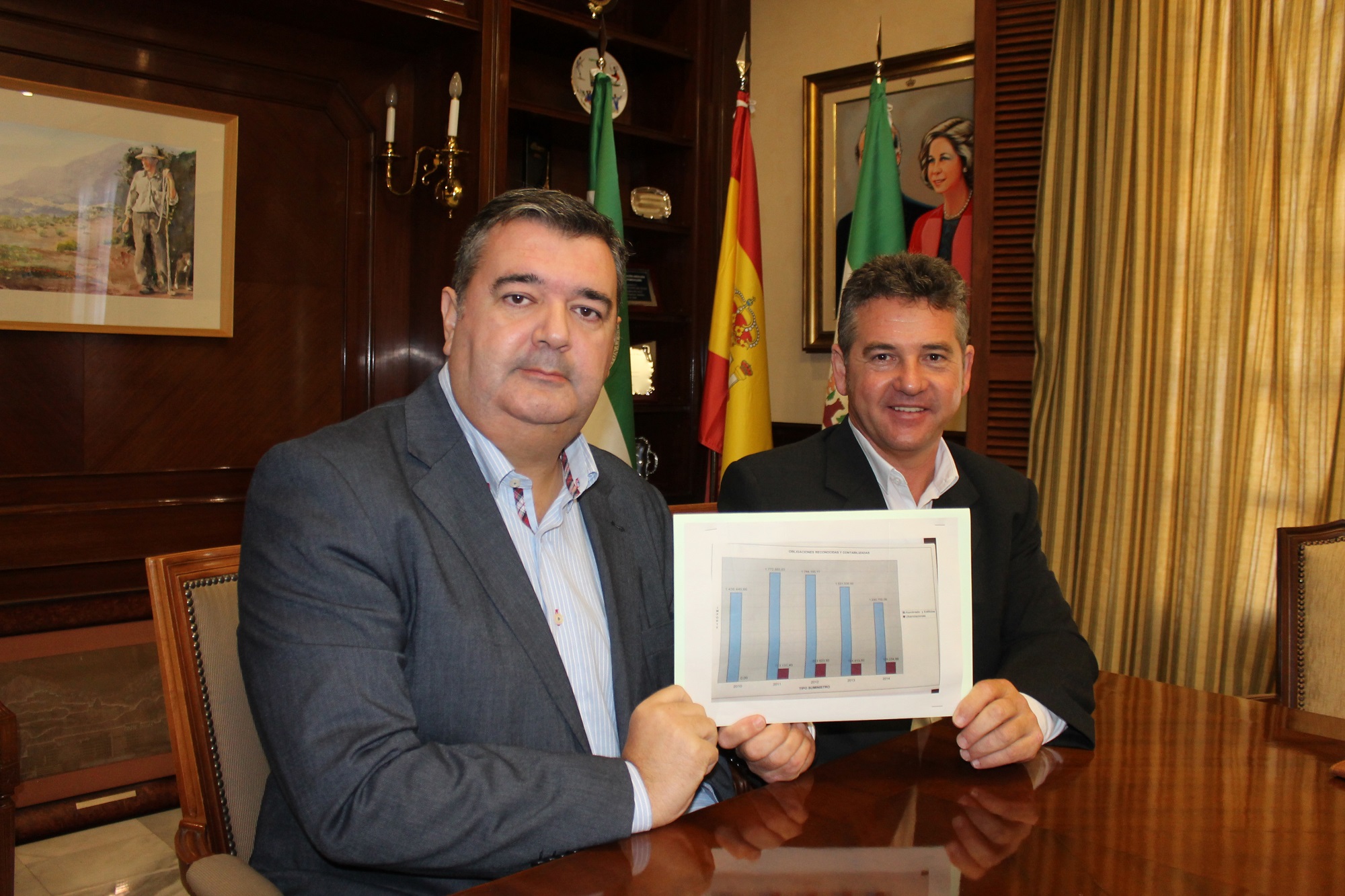 Mijas, 1 de diciembre de 2014.- El concejal de Economía y Hacienda en el Ayuntamiento de Mijas, Mario Bravo, y el concejal de Energía y Eficiencia, José Francisco Ruiz Fontalba, han informado hoy del ahorro conseguido por la institución local desde 2012 en materia de gasto energético, que se cifra en 500.000 euros.