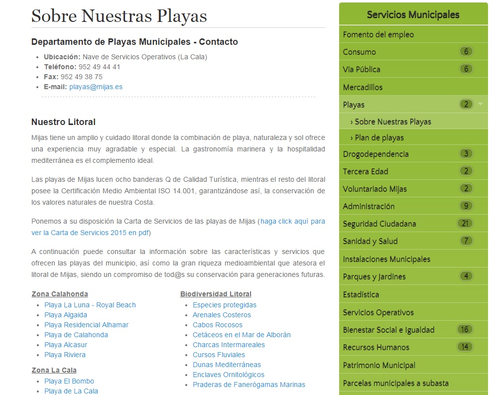 Así, los visitantes podrán acceder a esta información pinchando en el apartado de servicios municipales –en la parte superior de la pantalla de inicio- y clicando luego en la pestaña lateral de Playas. También se puede llegar a ella por medio del enlace http://www.mijas.es/portal/es/nuestras-playasz2/sobre-nuestras-playas.