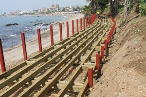 La instalación de la pasarela de madera está prácticamente finalizada en la zona de la playa de Calahonda y ahora avanzan por la altura del complejo residencial Las Rocas