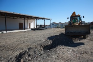 Se está nivelando el firme del exterior del recinto para aplicarle hormigón impreso y se han introducido canalizaciones pluviales para evitar correntías en los taludes de la avenida María Zambrano