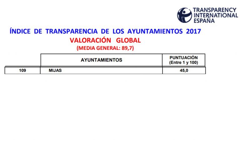 Mijas ha obtenido un 45 sobre 100 del análisis realizado por esta organización mundial, que estudia la transparencia en las distintas administraciones públicas de todo el mundo. En esta ocasión, el estudio analizaba la transparencia de hasta 110 ayuntamientos españoles. Sólo tres suspenden (menos de 50 puntos) y uno de ellos es Mijas, cuyo lugar en el ranking es la 109º posición, es decir, el segundo consistorio español menos transparente.